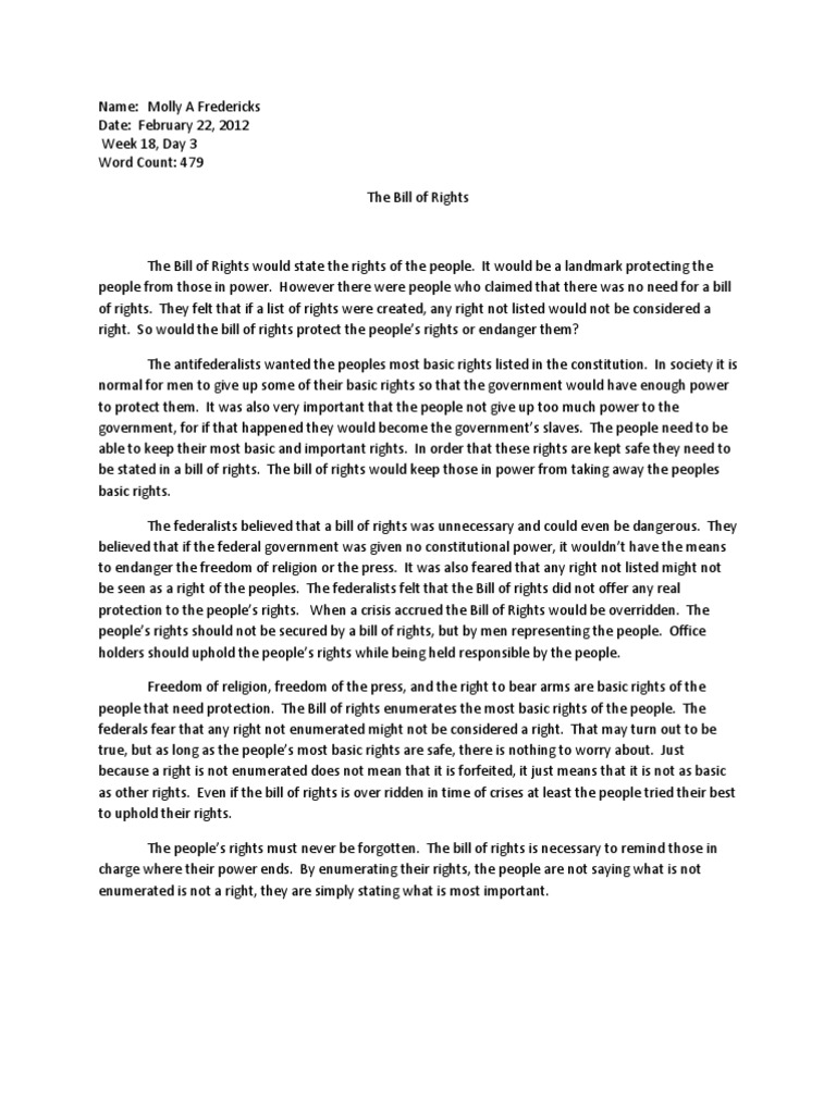 A bill of rights would serve as a fire bell for the people, enabling them to immediately know when their rights were threatened. Additionally, some Antifederalists argued that the protections of a bill of rights was especially important under the Constitution, which was an original compact with the people But before you make your mind about our essay writer and services, there are a few things you need to know. Hire Essay Writers for Completely Personalized Solution. There are plenty of websites on the internet where students can find academic essay writers for support Aug 30, · The English Bill of Rights was established in after the Glorious Revolution. This lesson defines the Bill itself, summarizes its contents, and delves into its history, including the effects
