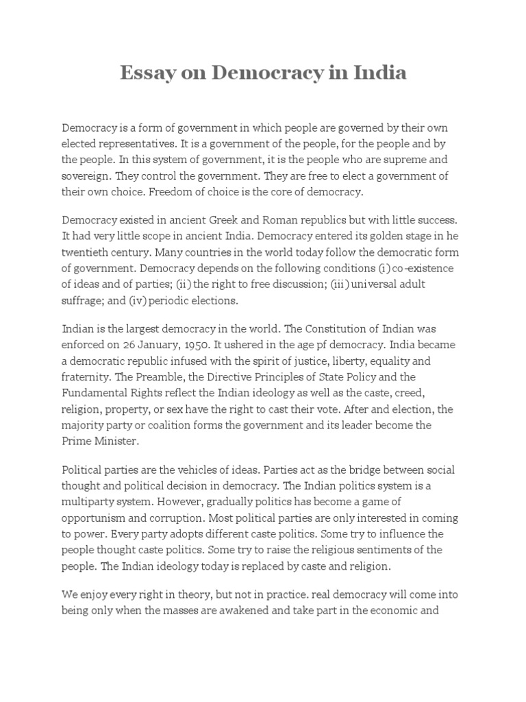 In all modern states democracies are indirect. Thus England, essays on democracy, the USA, France and India have essays on democracy democracy. Essay 3. Conditions Necessary for the Success of Democracy: Democracy in the world is plagued by several maladies. As a cure, different philosophers have suggested different needs which include the reform of the electoral rolls, introduction of referendum, initiative and recall and increased cooperation of the people in the public affairs and improved capacity of the citizens.